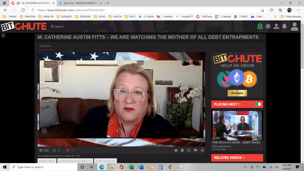 Click HERE for the video: M: CATHERINE AUSTIN FITTS – WE ARE WATCHING THE MOTHER OF ALL DEBT ENTRAPMENTS (bitchute.com)