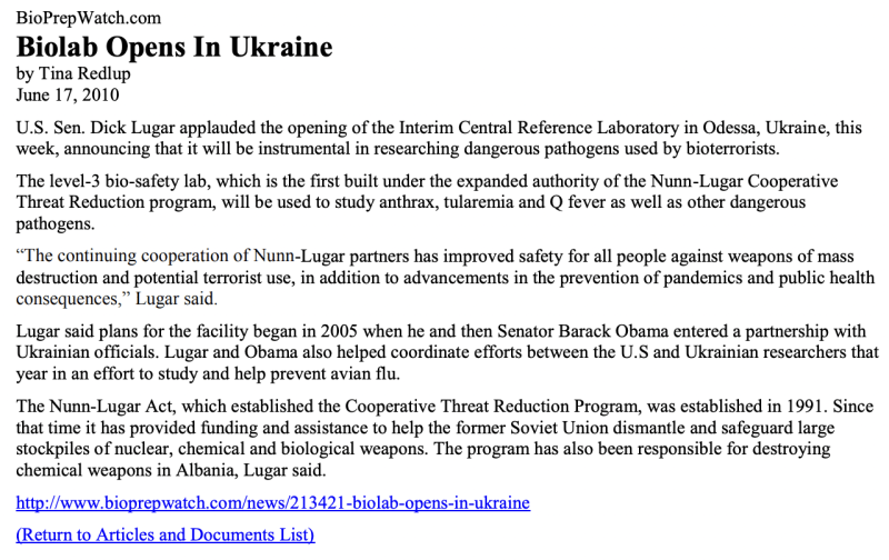 Originally posted (https://web.archive.org/web/20110522081423/http://www.bioprepwatch.com/news/213421-biolab-opens-in-ukraine) on June 18th, 2010, the article “Biolab Opens in Ukraine” details how Obama (https://thenationalpulse.com/2022/02/03/the-battle-for-tn-5-trump-defends-ortagus-pick-and-suggests-robby-starbuck-voted-for-obama-except-he-didnt/), while serving as an Illinois Senator, helped negotiate a deal to build a level-3 bio-safety lab (https://www.tradelineinc.com/news/2010-6/interim-central-reference-laboratory-opens-bsl-3-facility) in the Ukrainian city of Odessa.